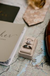I arrived Thursday morning to their Airbnb in Deming, the town closest to Mt Baker, where they had set aside a whole mother in law suite just for me! So kind of them! After getting settled, preparing my gear, and meeting the family, the adventure officially began. While Cori and Naomi got dressed and ready for the first look, I took all their detail items outside to the picnic table. Naomi wanted me to use a map of Mt. Baker as the background and I am obsessed with how they turned out!