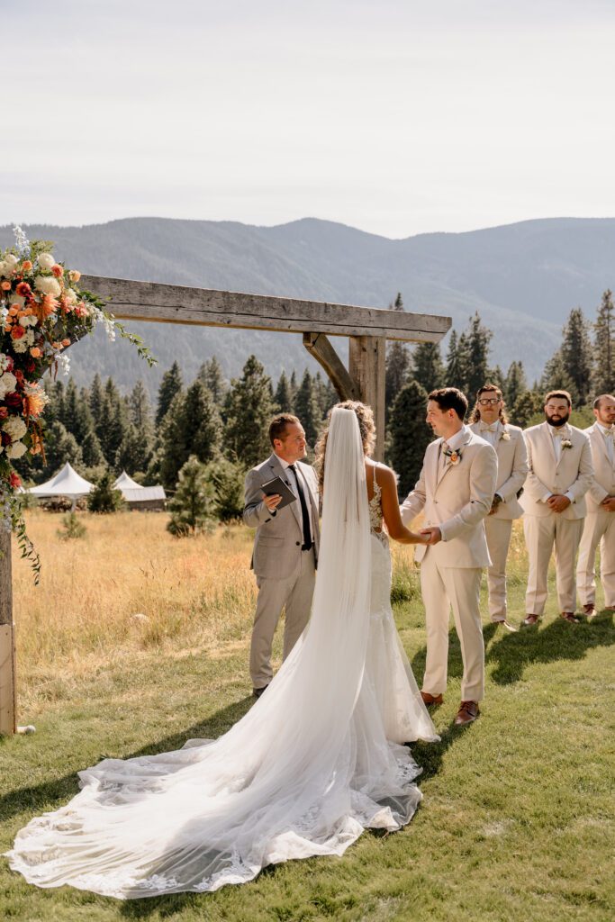 Washington wedding photographer capturing the mountain view during the wedding ceremony at Brown Family Homestead in Leavenworth, Washington